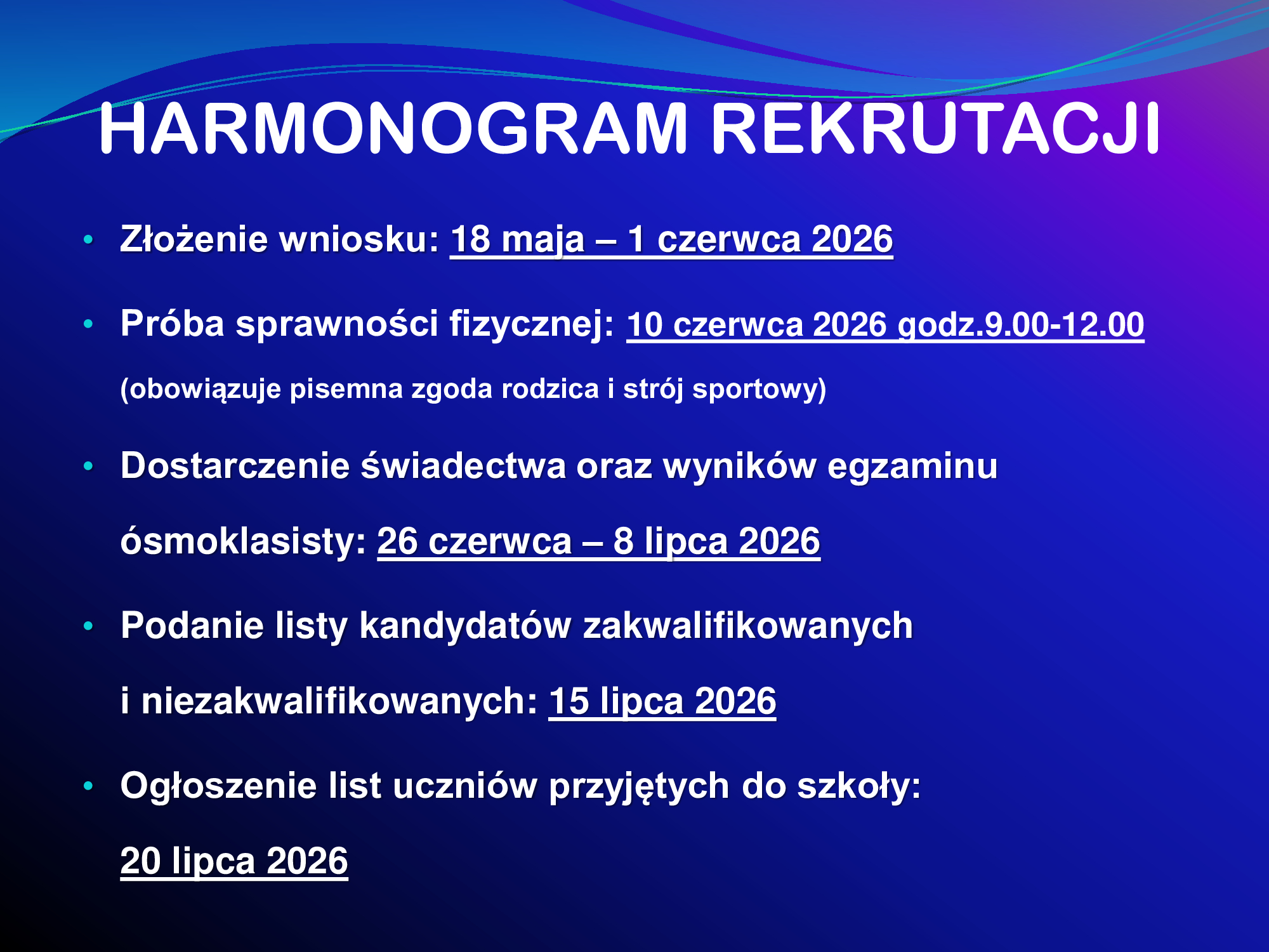 W związku ze zmianami, kandydaci do klasy mundurowej (policyjnej) będą przystępować do próby sprawności fizycznej w dniu 10 czerwca godz.9.00-12.00. Pozytywny wynik próby i odpowiednia ilość punktów uzyskanych za świadectwo i egzamin ósmoklasisty oznacza przyjęcie do klasy mundurowej (minimalny próg punktowy to 100 pkt). Składanie wniosków o przyjęcie do szkoły trwa od 18 maja do 1 czerwca 2026.