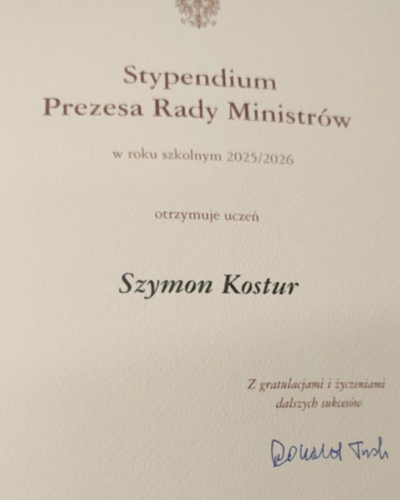 Szymon Kostur ze stypendium Prezesa Rady Ministrów