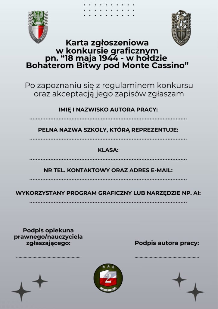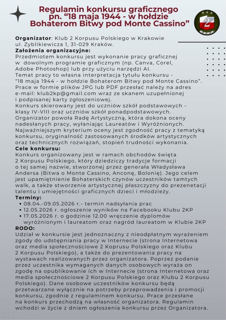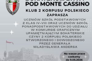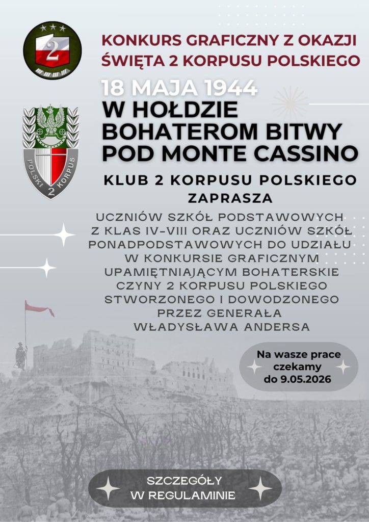 Zapraszamy uczniów klas IV-VIII oraz uczniów szkół ponadpodstawowych do udziału w konkursie graficznym, organizowanym z okazji zbliżającego się święta 2. Korpusu Polskiego pn. „18 MAJA 1944 – W HOŁDZIE BOHATEROM BITWY POD MONTE CASSINO”.